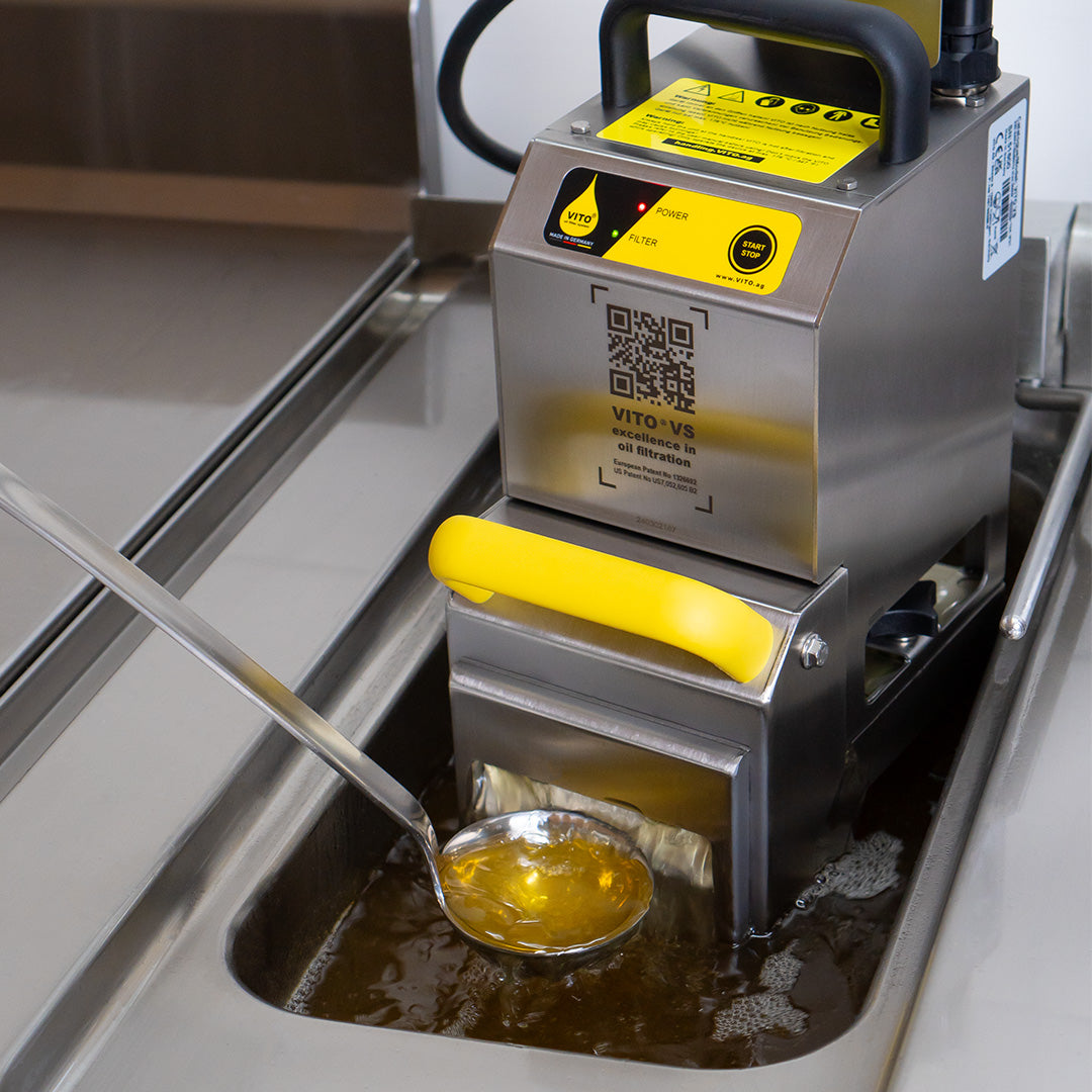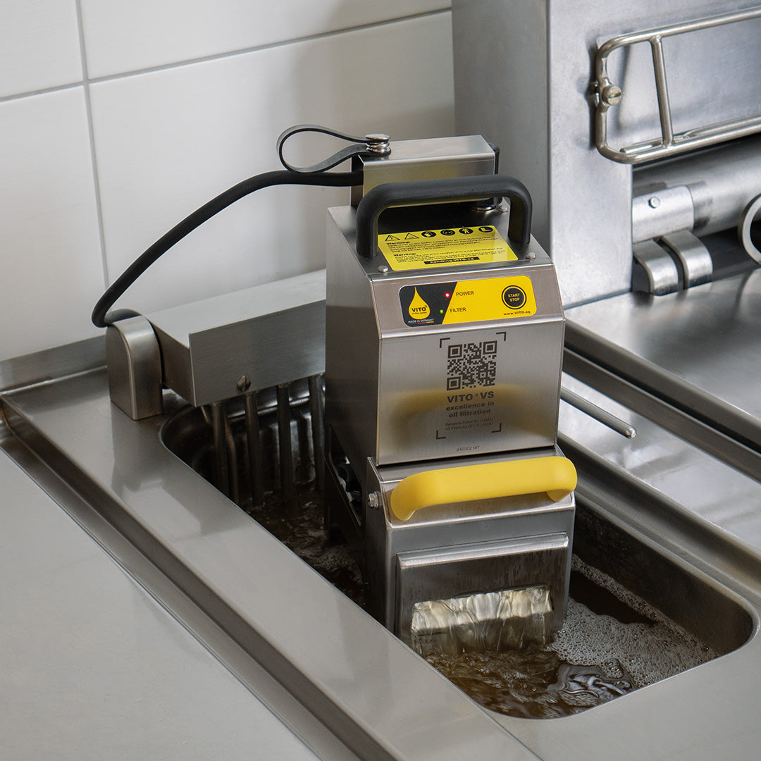 Con un peso de solo 6,5 kg, el VITO VS es ligero y compacto, adaptándose fácilmente a cualquier cocina. Gracias a la filtración diaria, puede ahorrar hasta un 50% de aceite para freír, lo que reduce significativamente los costos y mejora al mismo tiempo la calidad del aceite y de los alimentos fritos. En solo 4,5 minutos, el VITO VS filtra todas las micropartículas de hasta 5 μm del aceite, ¡sin necesidad de supervisión! Esto reduce el esfuerzo de limpieza alrededor de la freidora y le da más tiempo para centrarse en su negocio principal.
