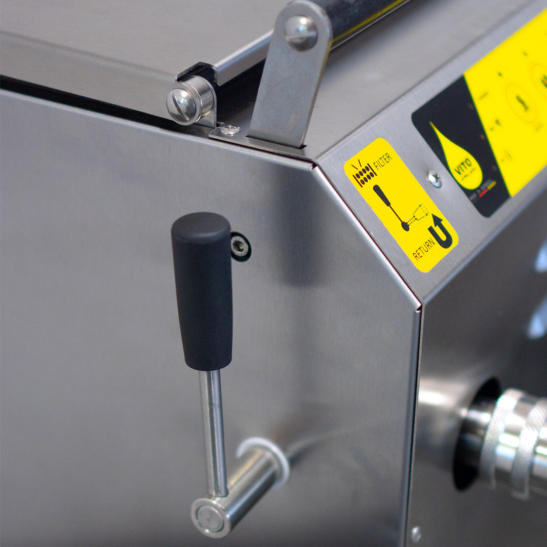 El VITO XM succiona el aceite directamente desde su freidora hacia su tanque y lo filtra hasta 5 μm de finura. De este modo, todas las partículas, como el pan rallado, permanecen secas en el filtro. El aceite limpio puede ser bombeado de nuevo fácilmente o eliminado tras la filtración. Gracias a las ruedas bloqueables y la empuñadura ajustable en altura, el VITO XM se mueve fácilmente por la cocina.